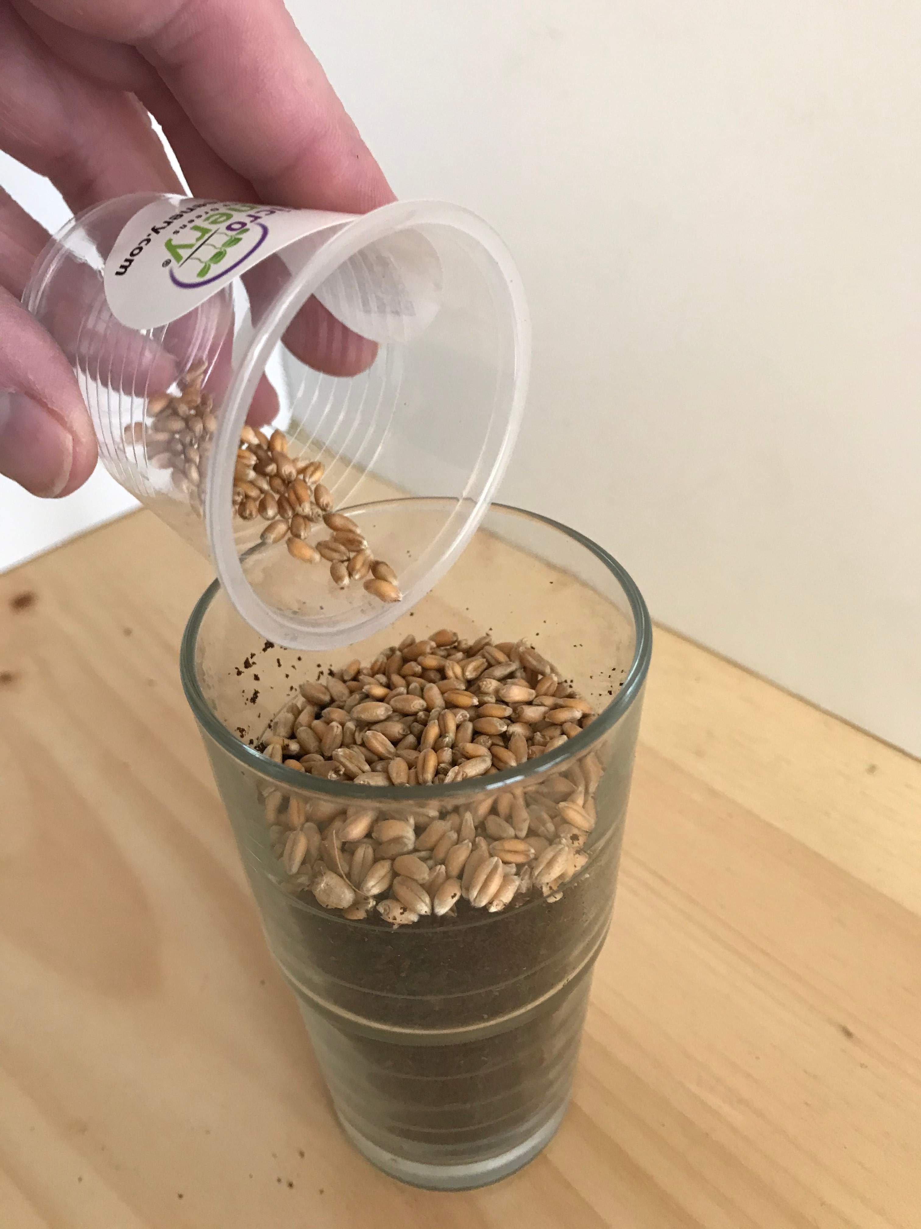 • Place wheatgrass seeds on top of fiber. (Optional: soak the seeds for 24 hours before planting)
