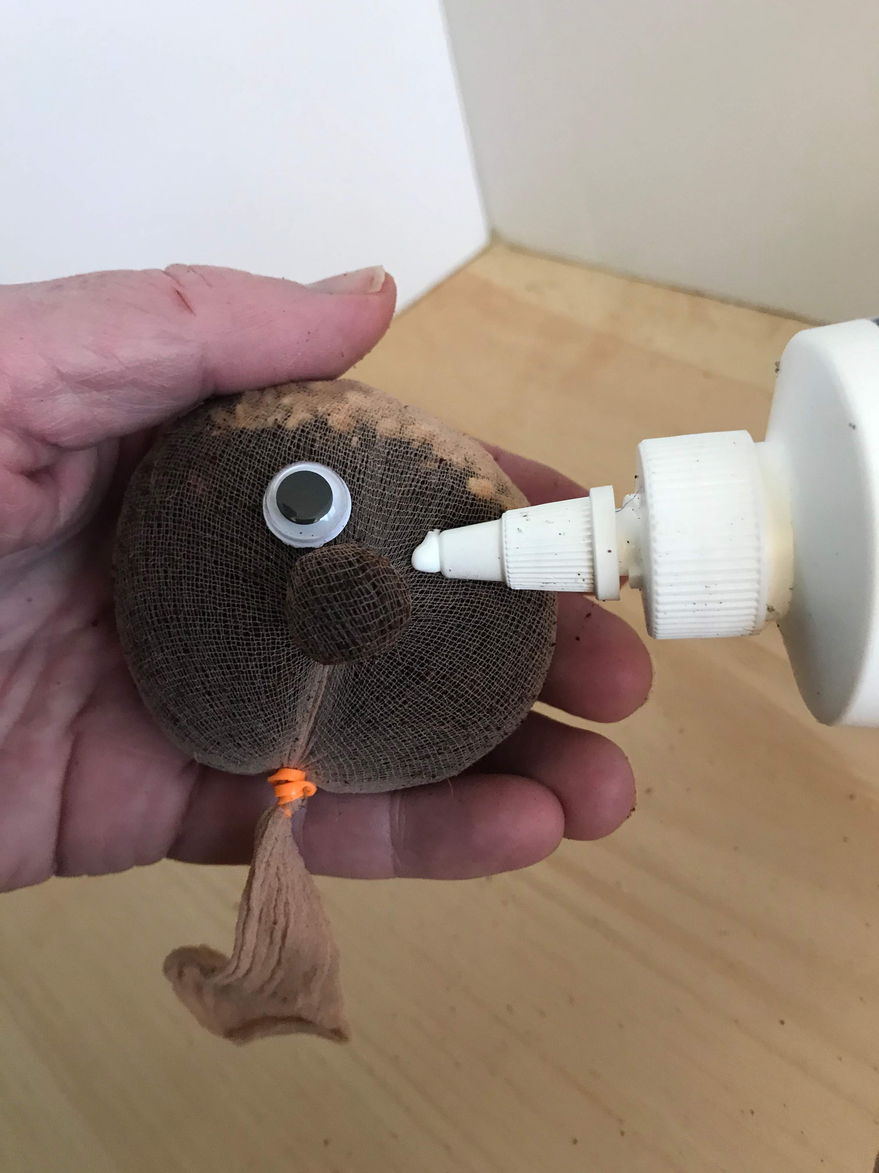 • Place him into the cup with the nose resting on the edge with the remaining piece of sock inside the cup.